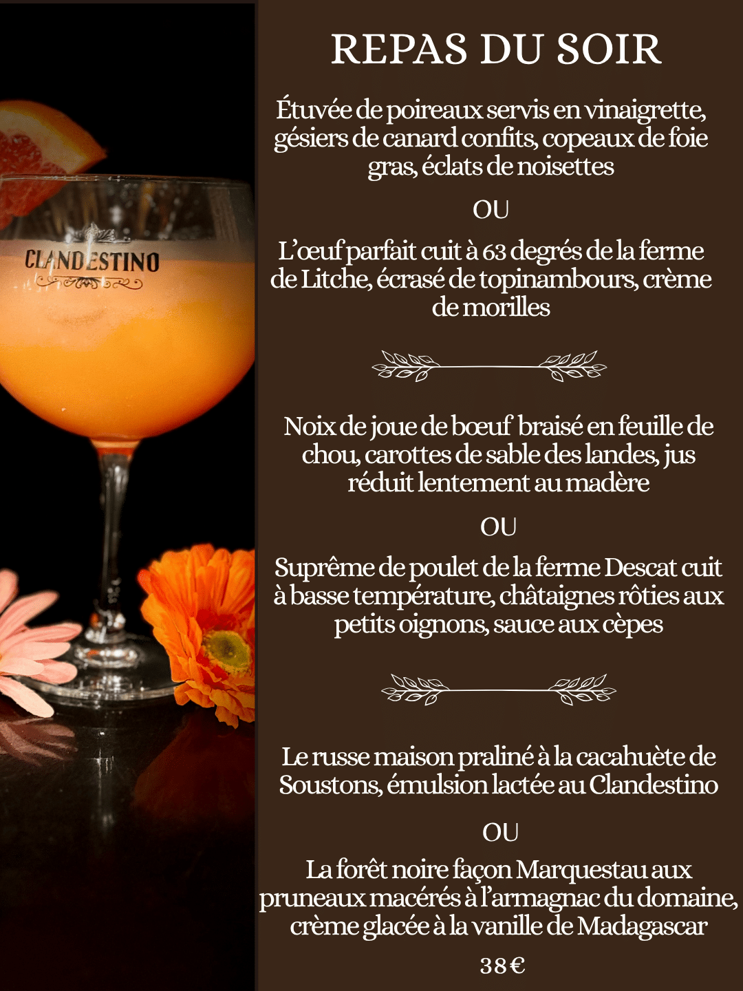 - Du mardi au vendredi : repas midi et soir autour de l’alambic